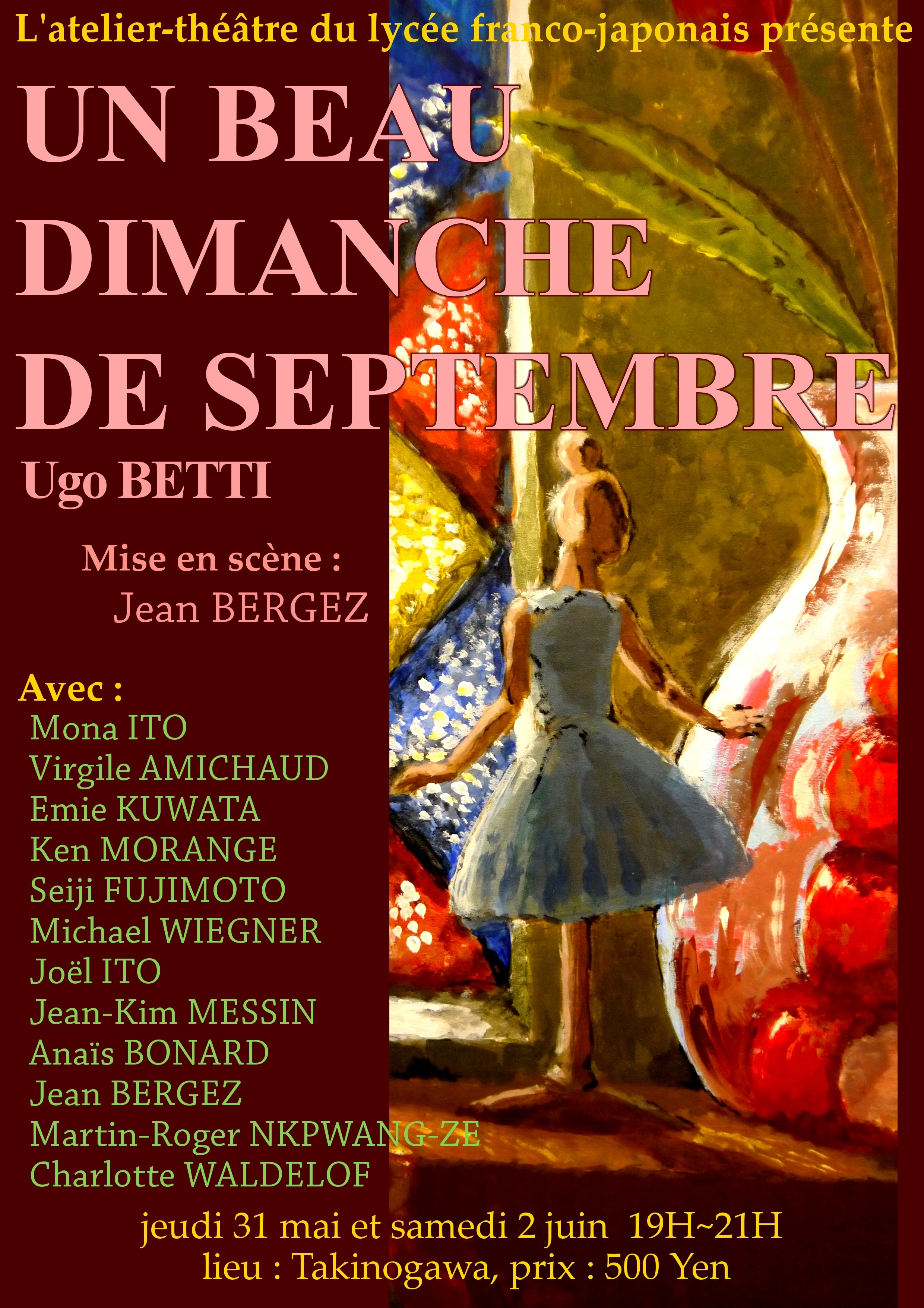 L’atelier-théâtre du lycée vous invite à la représentation de la pièce Un beau dimanche de septembre, dans l’auditorium du nouveau site du lycée à Takinogawa.