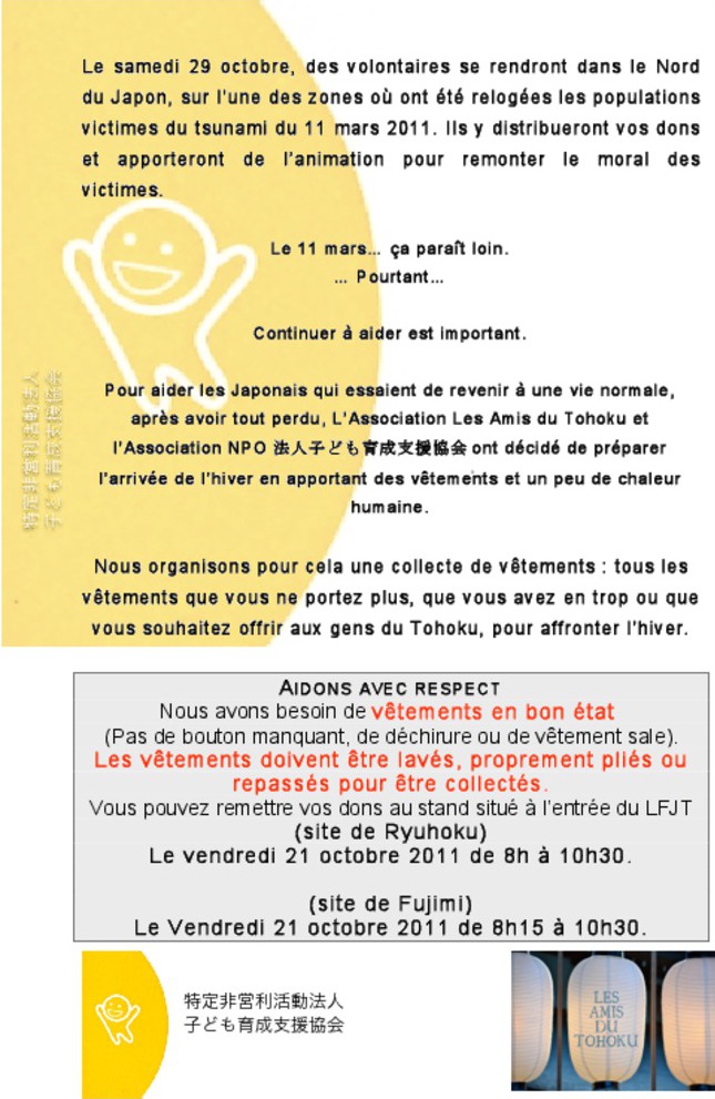 - En venant déposer des vêtements répondants aux critères de dons (voir ci-dessous) le vendredi 21 octobre au Lycée, le matin, sur les deux sites : de 8h à 10h30 à Ryuhoku et de 8h15 à 10h30 à Fujimi