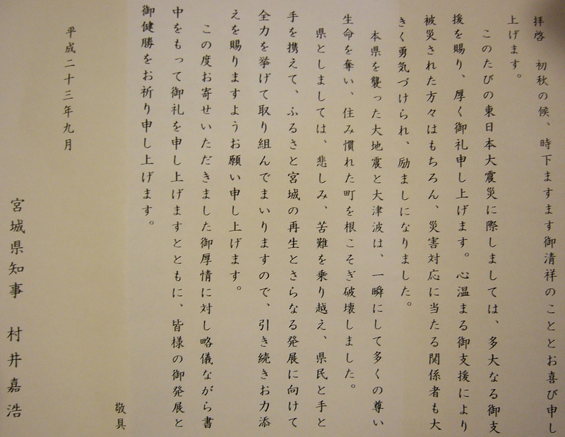 Nous sommes heureux de vous joindre ici la lettre de remerciement très émouvante que le gouverneur de Miyagi a envoyé à l’association Kodomo Ikusei Shien Kyoukai, avec laquelle nous collaborons. (lettre en japonais directement: cliquez ici)